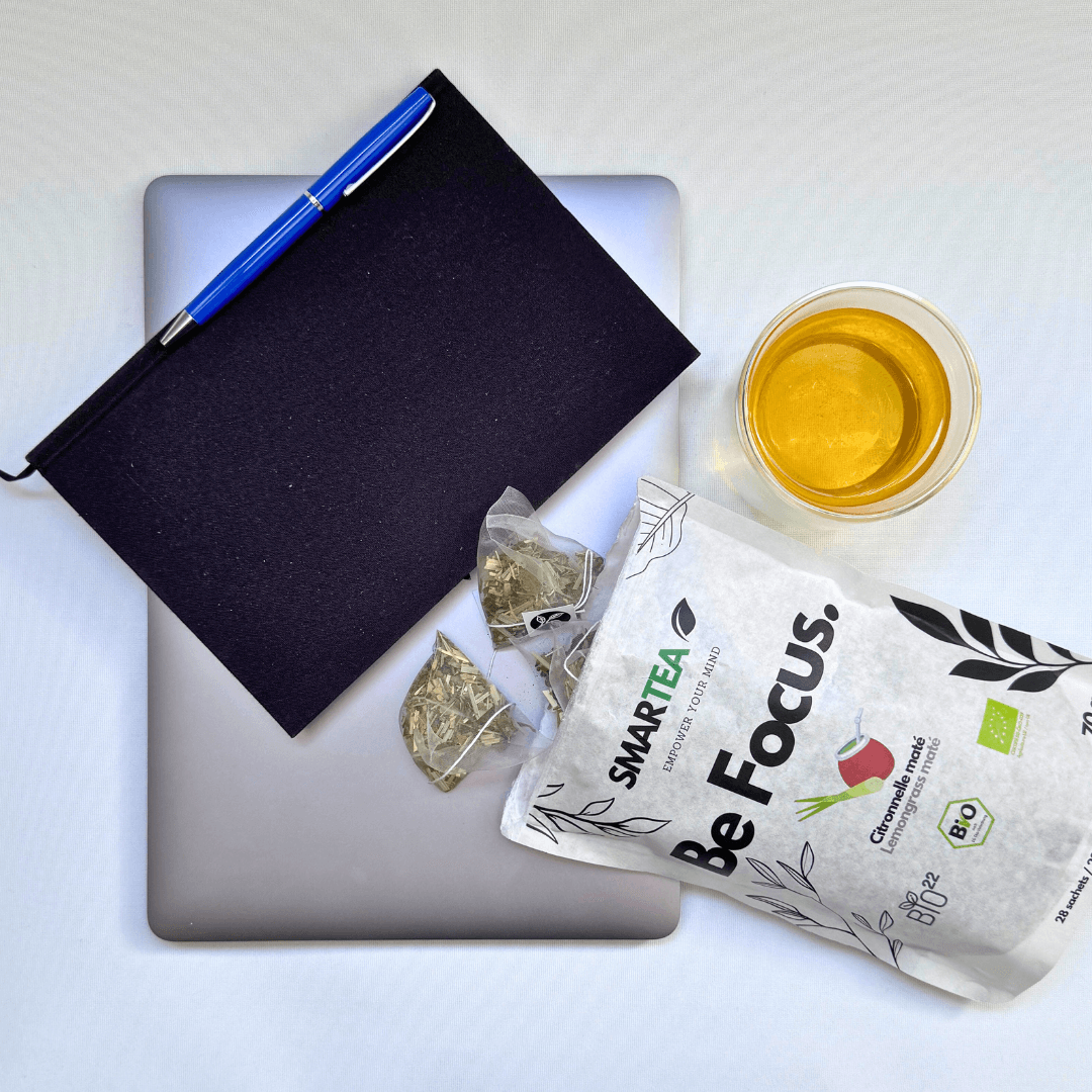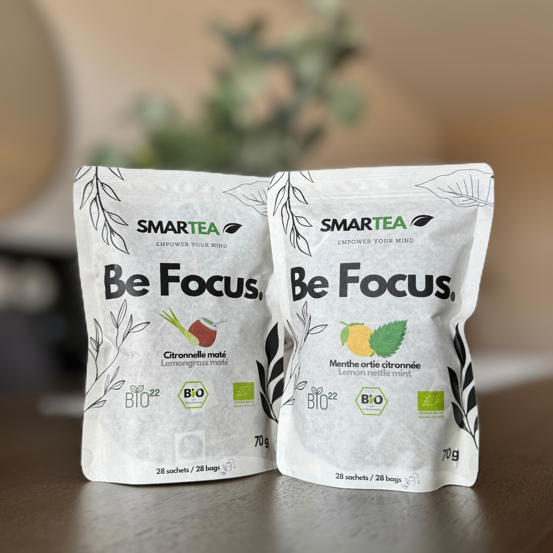 Chez SMARTEA, chaque ingrédient est naturel, certifié bio et sélectionné pour ses bienfaits sur la concentration, le stress ou l’immunité.