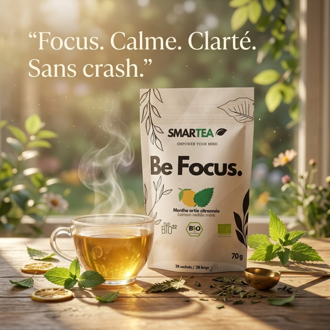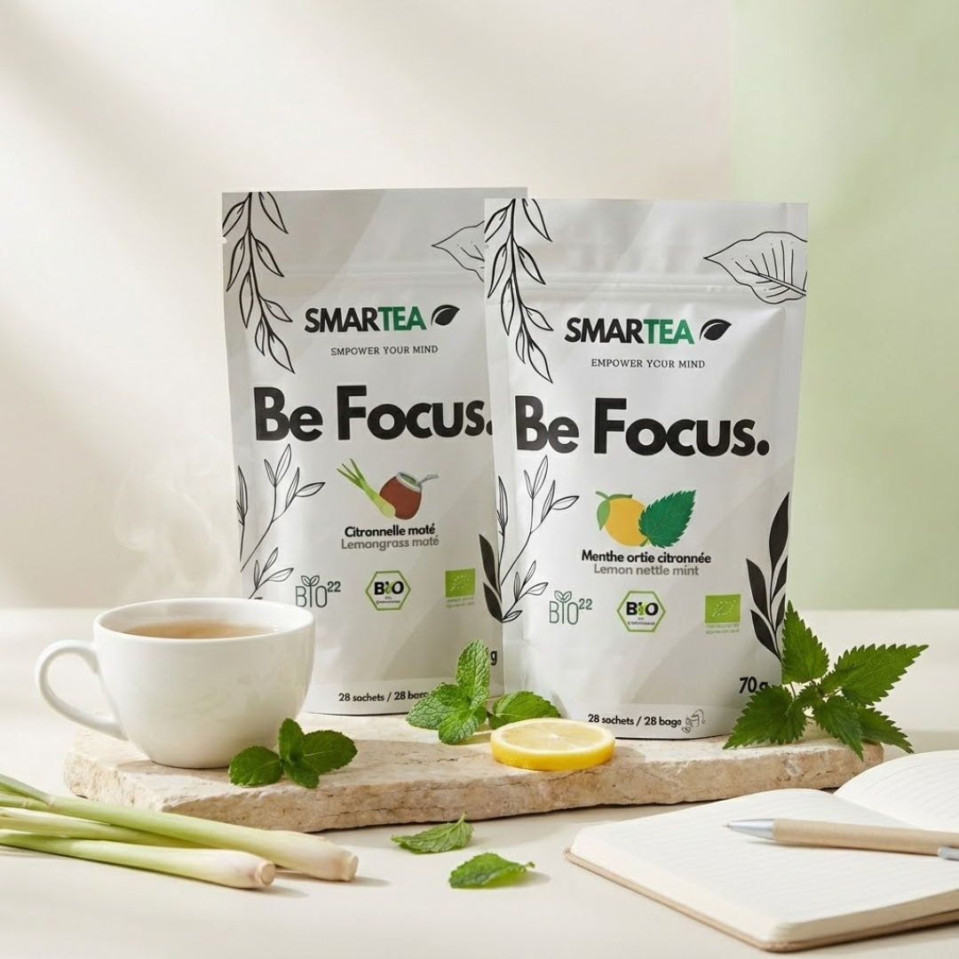 Chez SMARTEA, chaque ingrédient est naturel, certifié bio et sélectionné pour ses bienfaits sur la concentration, le stress ou l’immunité.